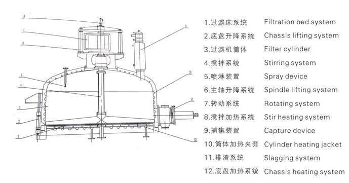 The equipment is composed of stainless steel vertical container, stirring device, sealed sealed shaft end, lifting mechanism, hydraulic cylinder, chassis, heating device, transmission mechanism, filter plate, unloading device, bracket, control system and other components to achieve the integration of electromechanical .
